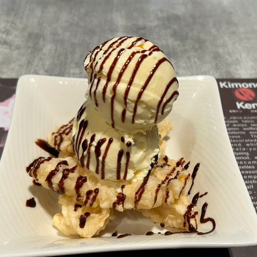 Crispy banana tempura topped with ice cream and chocolate syrup
